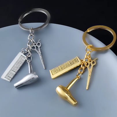 ハサミ、コーム、ドライヤーのチャームが揃った、美容師・理容師のためのゴールドキーホルダー。道具への誇りをさりげなく表現できるアイテムです。サロンの鍵やバッグのアクセントにも最適。