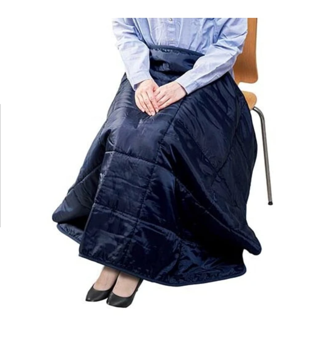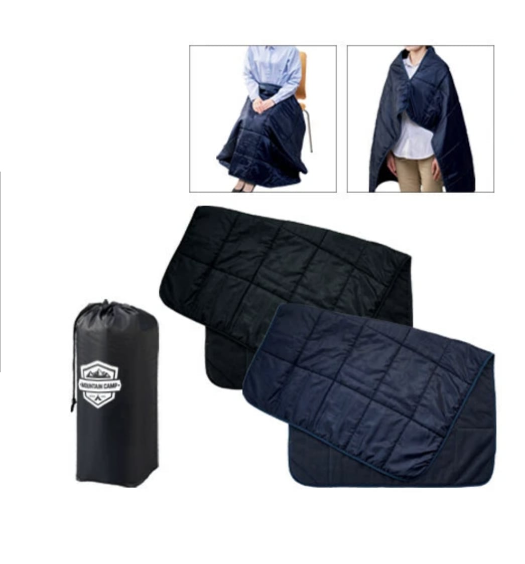 ボタンを留めることで、肩掛けや腰巻きとしても使える大判サイズのブランケットです。表面には滑らかなポリタフタ生地を、裏地には柔らかなフリース生地を使用しています。さらに中綿を挟んだ3層構造で、高い保温性を実現。季節が合わないときには収納できる巾着付き