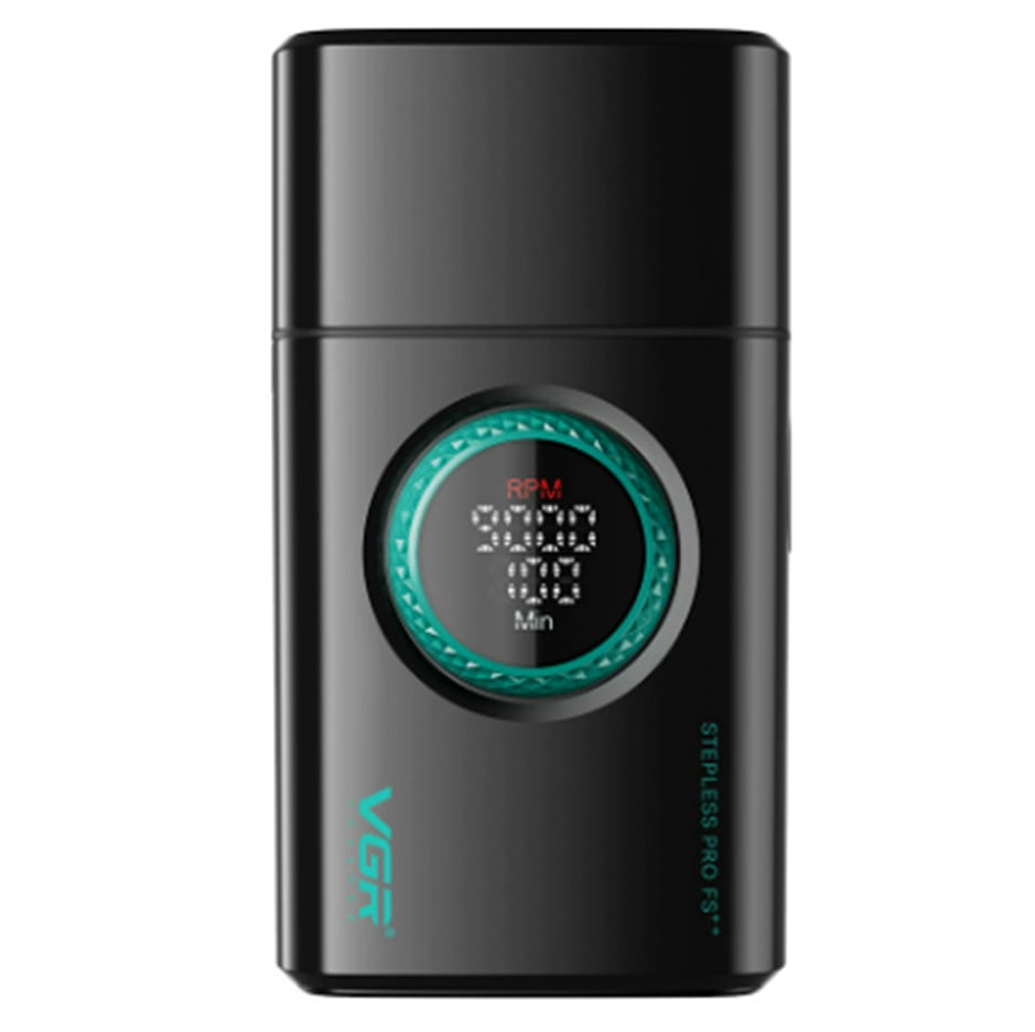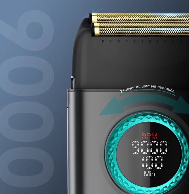 本体中央のリングはクリック感のある回転レバーです。リングを回すことでモーターの回転数を調整し、電池残量を分単位で表示することができます。急ぎの仕事、毛の細さ太さ、硬さや毛の入りにくさに応じて刃の速度を絶妙にコントロールすることが可能です。