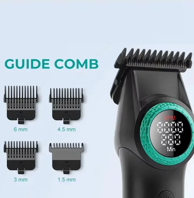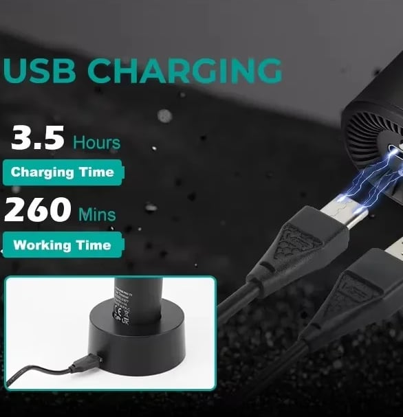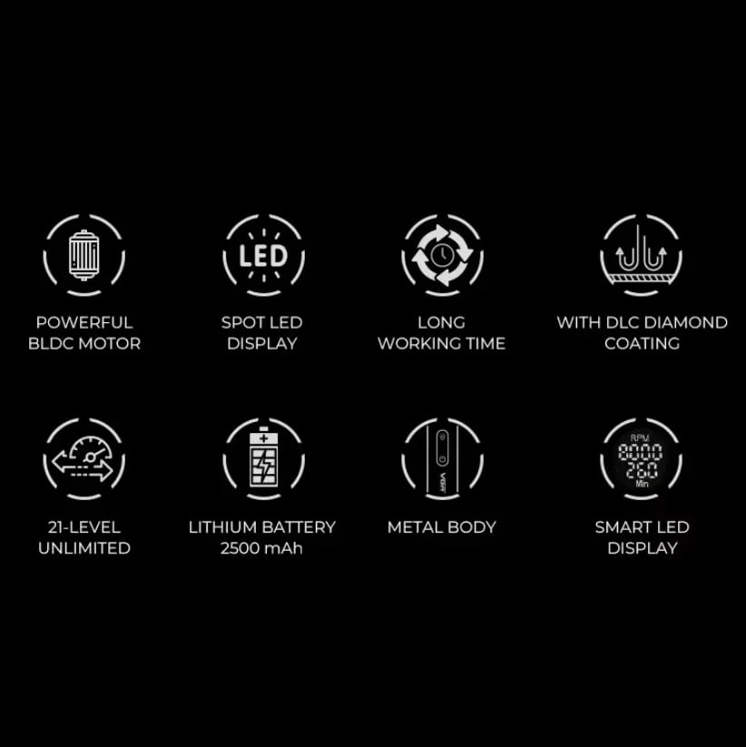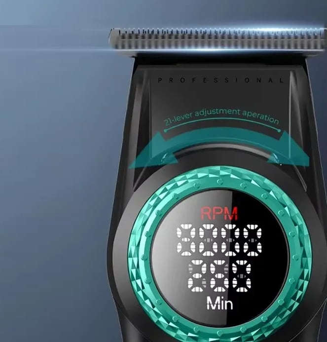本体中央のリングはクリック感のある回転レバーです。リングを回すことでモーターの回転数を調整し、電池残量を分単位で表示することができます。急ぎの仕事、毛の細さ太さ、硬さや毛の入りにくさに応じて刃の速度を絶妙にコントロールすることが可能です。