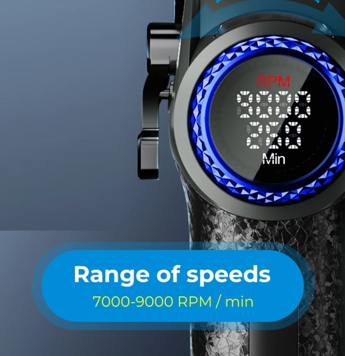 本体中央のリングはクリック感のある回転レバーです。リングを回すことでモーターの回転数を調整し、電池残量を分単位で表示することができます。急ぎの仕事、毛の細さ太さ、硬さや毛の入りにくさに応じて刃の速度を絶妙にコントロールすることが可能です。