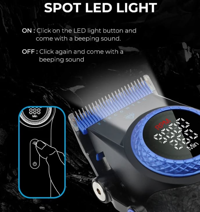 クリッパー・トリマーには電源ボタンのほか、LEDライトのON/OFFボタンがあり刃先を照らすことができます。明るさの足りない場所での施術や、疲れ目で見えにくいと感じたときの手助けとしてご使用ください。