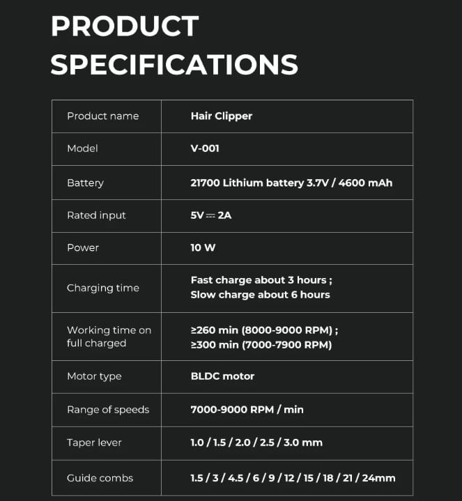 付属品:充電台、アタッチメントコーム10個(1.5・3・4.5・6・9・12・15・18・21・24㎜)、クリーニングブラシ、充電ケーブル(アダプタは付属しません)