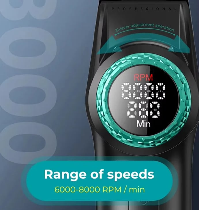 本体中央のリングはクリック感のある回転レバーです。リングを回すことでモーターの回転数を調整し、電池残量を分単位で表示することができます。急ぎの仕事、毛の細さ太さ、硬さや毛の入りにくさに応じて刃の速度を絶妙にコントロールすることが可能です。