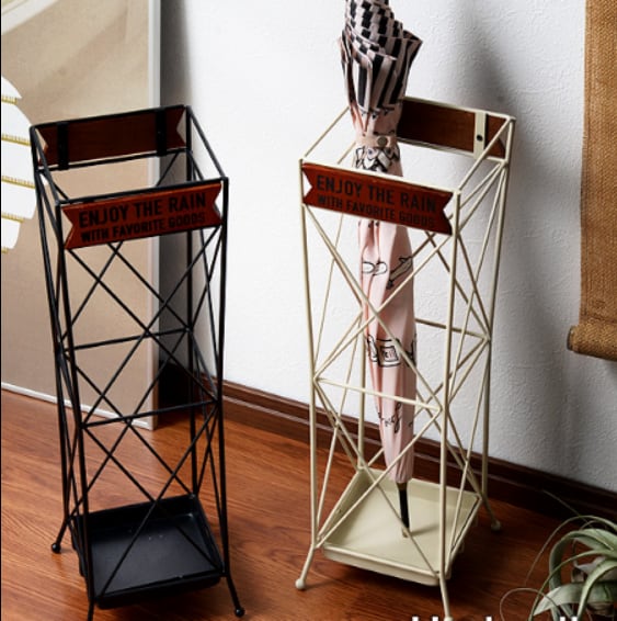 ざらっとしたラスティ質感の塗装と、シンプルな書体のロゴをプリントしたウッド、クロスしたワイヤーがスタイリッシュなスクエア型の傘たてです。